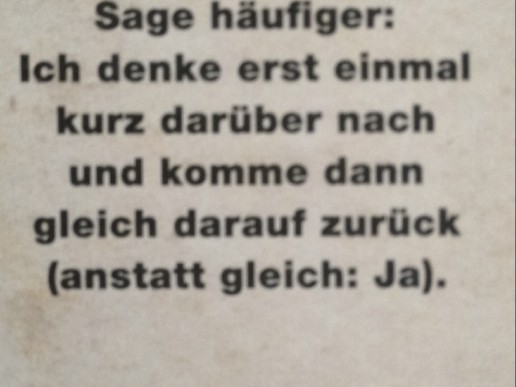 - Ihr Partner /Ihre Partnerin kommt mit dem Satz: „Schatz, wir müssen reden.“. Achtung! Jetzt nur nicht darauf eingehen. Schieben Sie das Anliegen weit von sich, reden Sie sich heraus. Sie haben dafür keine Zeit. Sie wissen doch wie das endet. Sie können ja streiten, aber lassen Sie sich auf keinen Fall auf eine wie auch immer geartete Abmachung ein. Bei so einem Streit wissen Sie woran Sie sind, die Fronten sind geklärt und nach einem Gewitter wird es auch wieder wie vorher.